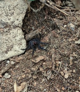 De sub unul dintre pietroaiele împrăștiate prin tot locul am pescuit fără să vreau un coleg exotic. Ar trebui să fie mic, dar e mare (enorm!). Și e negru. 8×8 de la mama natură – se mișcă năpraznic, mai mult nu-l vezi decît îl vezi. Trapdoor spider, se cheamă, îmi zice google lens. Asta pentru că devin iar agent de mediu și vreau să știu ce stric eu aici, dînd să repar… Și deci cum și de ce ajunsă domnu balaure ăsta din California tocmai la noi în grădină (pentru că e aceeași climă?)? Îl văd mai bine abia după ce reușesc să răstorn peste el cu abilitate pietroiul după care se ascunsese și să-l las imobil, căzut pe spate. Teribilă arătare, îmi zic și-mi masez umărul nătîng din care se pare că mi-am mai pierdut un șurub manevrînd unealta. Poate ajunge pînă la 20 de ani. Yep! 20. E extrem de discret, veninul nu are efect la om, dar mușcătura poate fi dureroasă. So… teribilă creatură! zic. Și fără să-mi dau seama se lipește de mine un sentiment de regret, de barbar, de ecce homo.